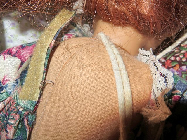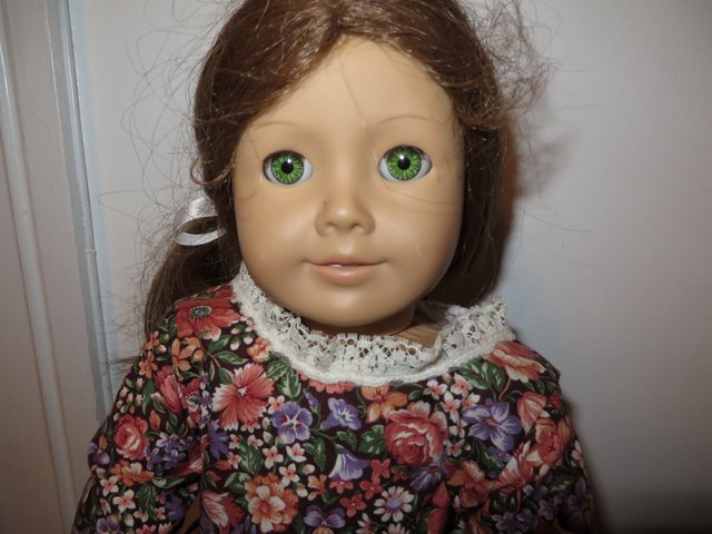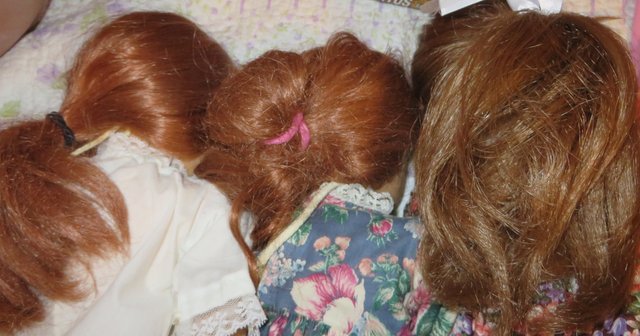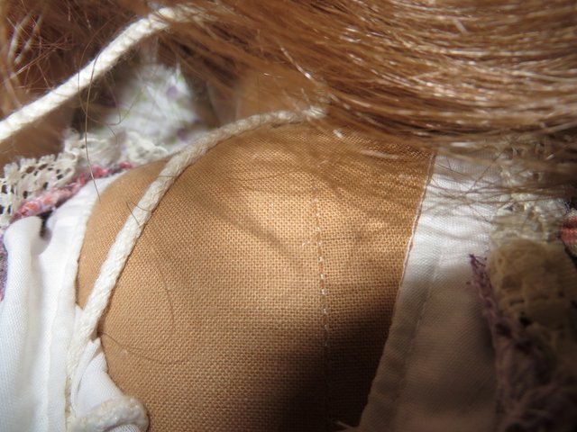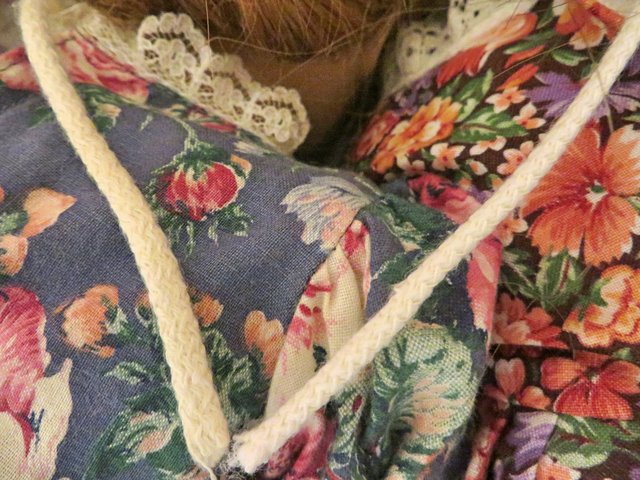 Three PM Felicitys. All are pleasingly plump, soft and squishy. Felicity 1 on the left is my original Felicity. She was a gift in April 1992 and I believe she's first edition. Felicity 2 in the middle belonged to my little cousin who is 10 years younger. I believe she's from 1993 or 1994. The earliest two Felicitys (1991-1992 and ca. 1993-1994)have ever so slight differences. The wig cap is different underneath and the neck strings are slightly different.  Felicity 3 is a secondhand waif. We have determined she is probably from 1997ish/late 90s. Her hair is slightly darker than the other two and her eyes show more white. The first two have copper red hair while the later one has slightly darker hair. It's only noticeable when they're together.    Comparing Felicity 2 and Felicity 3 neckstrings  More close-ups of Felicity #3, Faith