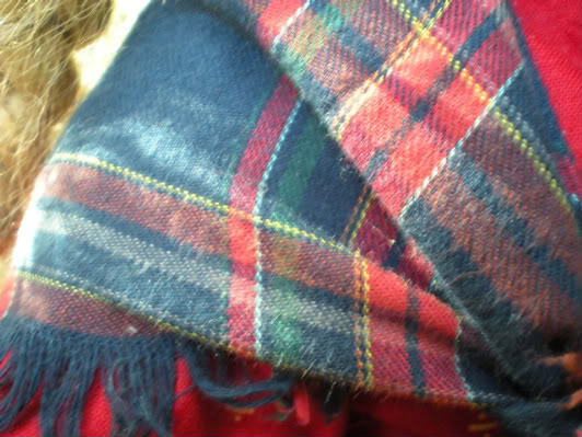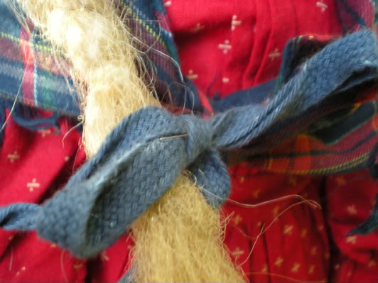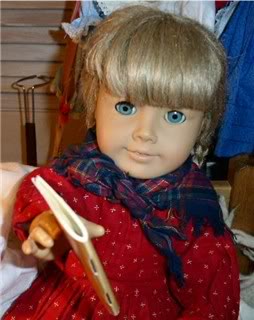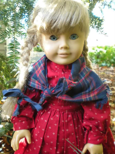 I like Kirsten's school dress. It is a pretty brick red color with a little design in off white that looks like division signs. (original version). The cotton thickness is a little heavier than her Meet dress and the velcro has held up better. The shawl I have (1980's version) is larger than the newest one and normal cotton material. It's just perfect for early fall days and very AMERICAN as opposed to the other two shawls which are specifically Swedish in nature. The hair ribbons that come with the dress are a pretty smoky blue color but an odd choice for a red dress. They coordinate with the shawl though and the whole ensemble looks very nice together.
