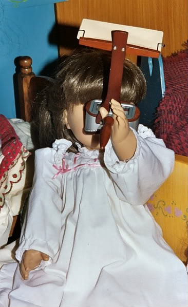 Samantha bought this set when we went to AGP Chicago. It came with the parasol, a little hair brush, a little mirror and a stereoscope. Johanna already reviewed the parasol but I will add that it it too big to be for Samantha and it's too heavy for her to hold. The hair brush and mirror set are too small for Samantha and I say they are doll sized for Samantha's doll! They are made from shiny plastic and not very high quality. They feel cheap and were rather disapointing. The stereoscope is amazing. It's real wood and metal and comes with heavy duty cardboard cards to put in the stereoscope for Sam to look at. Grade: B