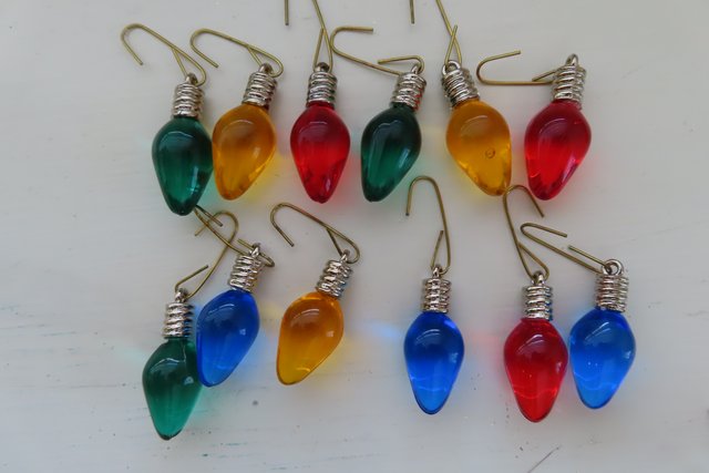 18 frosted icicles: I can't tell for sure if these are plastic or glass. I think it's hard plastic that looks convincingly like frosted glass. They're pretty and don't feel too fragile.  12 colored balls: These aren't balls at all - They're ornaments in the shape of light bulbs. They're made from translucent colored plastic. The light bulb "base" where the ornament hook attaches is a separate piece of metallic plastic. Several of mine have had the bulb part fall out of the base, but they're easy enough to glue back together. The set comes with 3 green, 3 yellow, 3 red, and 3 blue.