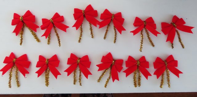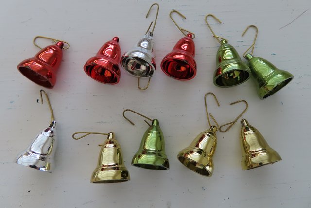 12 velveteen bows: Bows made from red velvet ribbon with gold pipe cleaners twisted around the center. 12 assorted bells: Metallic plastic bells. 3 red, 3 green, 3 silver, 3 gold.