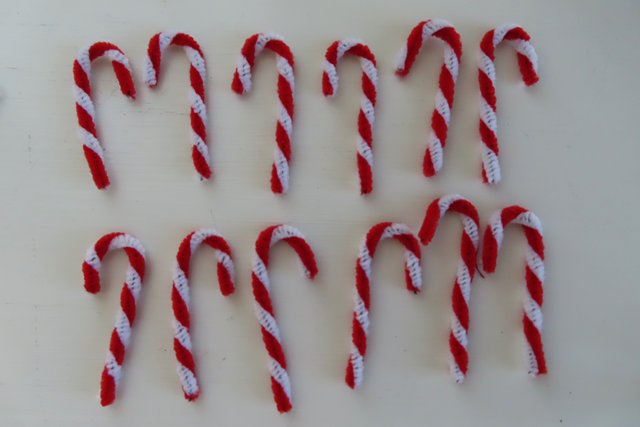 12 candy canes: Made from twisted pipe cleaners. 25 mini glass balls: These are metallic plastic, not glass. The ones I have look the same as the ones in the catalog photo, so I'm not sure if the set ever came with glass balls instead of plastic, or if it's just a mistake in the description. Either way, I prefer these plastic ones since they're not as fragile.