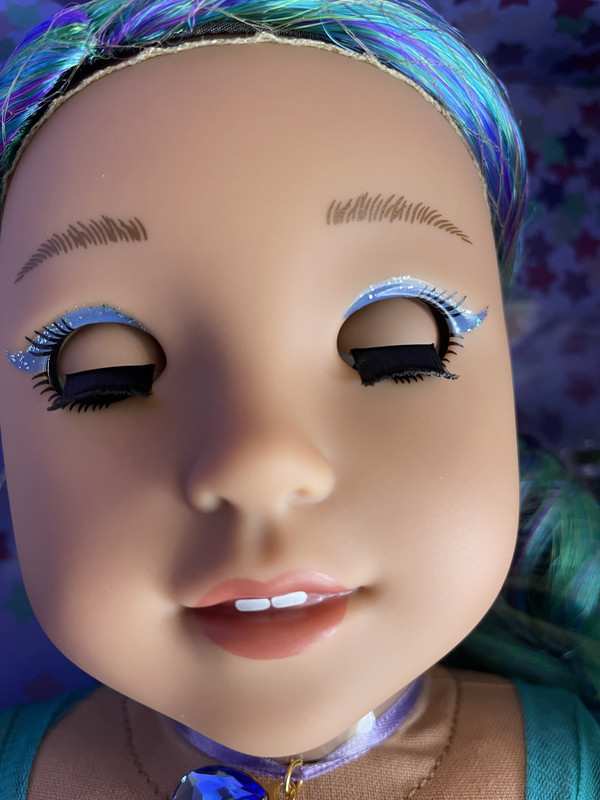 Also includes: A pair of iridescent elbow-length gloves, a gold purse with a peacock printed in lavender glitter, a pair of glittery gold sandals with crisscross ankle straps, a pair of underwear, and a numbered certificate of authenticity $265I held off on replying to this thread because I wanted to make sure I was happy with the Doll I received before posting. I am HAPPY to report I absolutely love this Doll and she does not have eye defects that I was worried about...or at least not from my perspective/opinion. I think from the reviews that bingandnelsonfan has done that the Nanea mold has less eye defects in general. If I am misquoting or I got that wrong I am very sorry! I think AG picked a good mold to have a no returns policy as from what I understand you get more eye defects with Classic mold than any others. I've attached a few photos so hopefully this might help some folks one way or the other. Yes, the eye color is subtle and I think very fitting. Overall I think she's gorgeous! My only complaint would be that once again the accessories are not easily accessible without damaging the box. This carry-over from Barbie I am not happy about. :-( But very small complaint compared to how much I love this Doll! https://www.instagram.com/p/Cilb-kLujIy Mine just arrived! She’s quite a fantasy doll.  Her eye makeup is a bit uneven. It goes to the edge of her lashes on one side but not the other. It’s not a big enough deal for me to worry about.  Warning if there are any parents hoping to surprise their children: the box she shipped in is not subtle about the contents!  My Sapphire Splendor doll arrived today! I don’t have a way to upload pictures but wanted to share a few thoughts for anyone still on the fence/for future reference. I ordered her during the Silver/Gold preorder, and this order put me over the threshold for Berry. I got the 4.5x points as if I had been a Berry member at the time I placed the order, which I thought was nice. The number on her certificate is in the 13,000’s, so assuming they are shipping in numerical order, they seem to be selling at a good pace. (Incidentally, the place where the number is on the certificate appears to have been carefully rubbed off and reprinted, presumably when the run was reduced to 18,000.) Overall she is very pretty. I had been worried about reports that her lip paint was a clashing coral color but mine looks like the rose color on the website, only less shiny. Overall her color scheme is very harmonious, although her very light eye color can give her a bit of an intense stare. Her base hair color is turquoise with purple highlights, and you can see strands of lime green, magenta, sky blue, and royal blue that add depth to the colors. Her wig is on the thinner side, but overall looks nice and is well-styled. The texture is like the wig on my TM #92. My doll’s biggest flaw is in her left eye where the lavender color extends past the iris into the white of the eye, so that her iris is not perfectly round. I’m still trying to figure out why this might be—I think her eyes may be made of lavender plastic with the whites painted on top, and some of that white paint chipped. It’s disappointing, but I’m probably just going to keep her as-is. The Swarovski crystals are gorgeous. I had always planned to take this doll out of the box and play with her. The fact that she has crystals only on the front of her bodice, necklace, earrings and crown means I can sit her down places without worrying about scratching any crystals. I also like little details like how the tiers of her skirt are cut in wavy lines, and I love her strappy sandals. Some unfortunate aspects of her outfit are that her gloves appear to have permanent little creases where the plastic restraints held them, and her necklace, once you take off the rubber band and clasp it properly, hangs down on top of the crystals on her bodice—perhaps why it was tied up in the first place, to avoid damage in shipping. Finally, the only annoying tags I noticed were inside one glove, and looped around the handle of her purse (where it can be easily cut off without leaving a stub.) Her box is very nice with foil stars and a sturdy viewing window—I will probably actually keep it, and I never keep boxes. It even came neatly wrapped in tissue paper to avoid scratches, which I thought was a nice touch. Anyway, I was one of those people who really loved the promo pics for this doll, and my opinion hasn’t changed. My biggest disappointment is her chipped eye.