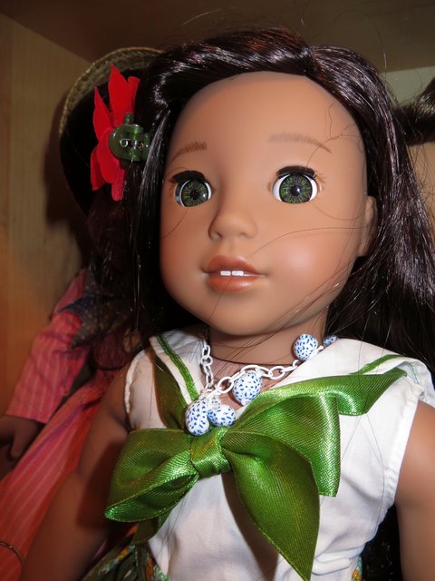Nanea has medium skin, big hazel eyes that open and close, wavy dark brown hair, and painted on additional eyelashes. She has her own unique face mold with a pointier chin and rounder eyes. Overall, her head is smaller than all of the other molds. In my opinion, it looks too small for her body. She also has a very flat face when you look at her profile. Her eyes are a beautiful light hazel. I noticed that the white part of her eyes seem to be raised a bit from the coloring. I assume this is because she has very round eyes and this helps to hide the metal and make her eyes pop. They are a bit far apart as well. Her eye sockets are so big you can see the numbs that help to make her eye open and close on the inside. The painted on lashes and corners of her eye aren't as noticeable from afar. They are definitely something that will take time to get used to, along with her mold. Her checks don't have much coloring and her lips are a nice medium nude color. Nanea's hair is very dark brown with some lighter brown and almost plum colored highlights. It is nice and wavy/curly. Her hair is pretty thick compared to some of the other dolls recently released. It seems easy to style! I would say on a difficulty level to manage, her hair is in the middle. She really is a sweet doll and is one of the more unique AG has released.