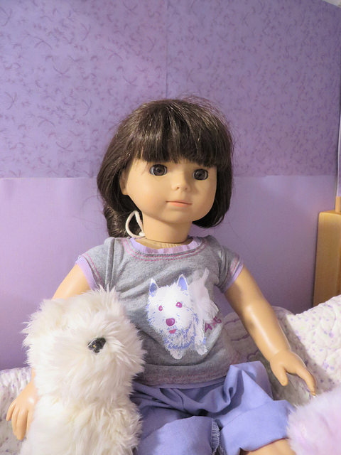 This is a gray shirt with purple accents. The material is thinner than an AGP doll shirt and the velcro doesn't come all the way down, exposing the AG's backside a bit if you're looking at her from behind. It fits VERY snugly on older dolls but looks cute on the Wellie Wishers. I love the little tulle skirt on the Westie. The tulle ruffles at the neckline and sleeves look a little out of place for a t-shirt. The graphic feels cheap and I don't like how the Westie's eyes and ears are colored purple. I got this shirt with my Kohl's Rewards coupon and then Willa walked off with it. Luckily Willa's mom got another one on sale for $5 (late 2017) so Susanna had a backup. Grade for the $5 price: A Not worth $10- $8 would be pushing it, $5 is a good price.     Seeing double!  Alice looks beautiful in this t-shirt.