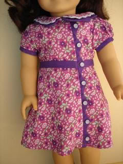 Your Ruthie doll is 18" tall with wavy dark-brown hair and gray eyes. Ruthie is Kit's best friend from 1934. She comes in a pretty purple dress, a purple hair bow, blue socks and black shoes. She is so pretty, her hair is dark! Almost as dark as JLY #25's. I'd say it is Jess's color and her eyes are gray. Her hair is curly and easy to style, and will look good in lots of styles. I love Ruthie's meet dress because it is light and summery. The cotton is thin and soft, similar to Egyptian cotton. The detailing is cute, and Ruthie looks fantastic in purple. I give Ruthie a B just because she has gray eyes instead of the beautiful brown that is shown in her books. Otherwise she is perfect!