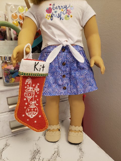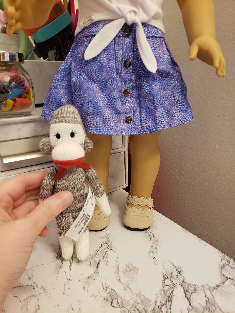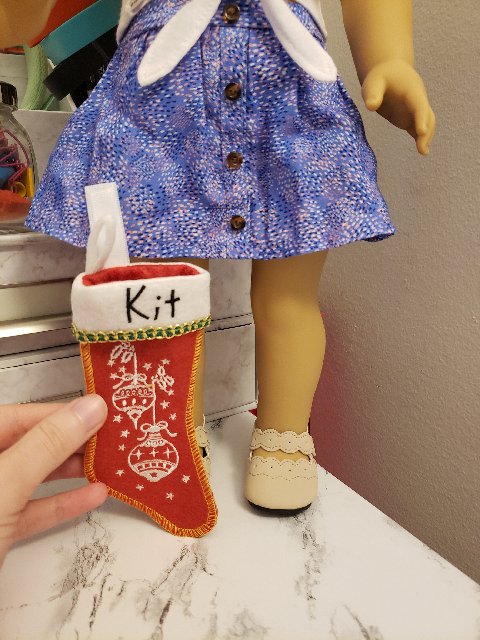 Released in 2017, retired in 2019.Kit's Aunt Millie recycles everything - she would appreciate making socks into a monkey. Includes a felt stocking with a sock monkey.I didn't see a review thread for this, so I figured it was time to make one... Sock Monkey - AMy sister hates sock monkeys, so I had to get this for that reason alone. Joking aside, it’s a cute, fairly standard toy. I could do without the HUGE tag. It's appropriately sized to Kit. Stocking – A-I honestly don’t care for the kind of cheap-feeling felt material. The embroidered design is nice and I like that Kit’s name looks hand-written. Again, it has a big, stupid tag. It’s fine, but not incredible. The sock monkey fits inside nicely and looks pretty cute. Good Value?Honestly? I’m not sure it’s worth the $20 I paid. The sock monkey is nice, but the stocking feels a bit cheap. I only jumped on it because the BeForever line was being phased out and I didn’t want to miss it, otherwise I might have waited for a sale or coupon. Overall - A-Since I don’t have Kit’s Amelia Earhart doll, I like this set as a Christmas gift for her. The sock monkey is very cute and is sized to be a satisfying gift for Kit. The stocking leaves something to be desired – I wish it was just a bit thicker and made out of a nicer, maybe less-stiff material. Maybe it’s period authentic? I don’t know. Kit looks happy, at any rate, and I’m pleased to have a gift for her.