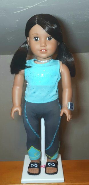 The sandals look great and are very authentic to what a lot of kids wear before and after sports practice. They’re thick black plastic slide sandals with the white logo on the top. They were one of my favorite parts of the outfit until I realized that without the clear strap that so many sandals come with, they tend to fall off easily. In the book, Joss wears "cheer shoes" (sneakers) during practice, and I do kind of wish the outfit came with both, but I suppose that would be asking too much. Grade: B+