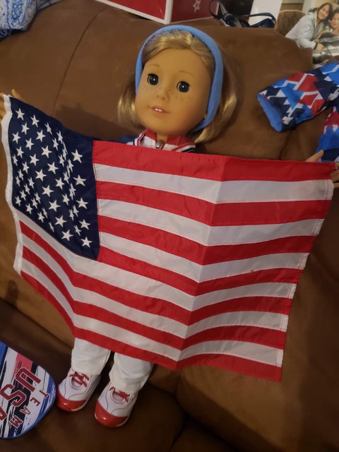 A U.S. flag a doll can hold up proudly or drape over her shoulders using the attached thumb rings