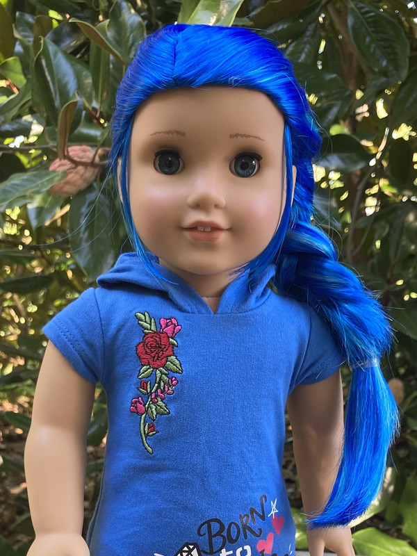 Next, as to her hair: It is a rich blue color with lighter blue highlights and arrived in a cute side French braid that was already quite messy so I immediately set it free. The braid gave it some loose waves that have already mostly relaxed themselves. There are short pieces that frame her face on each side. I've noticed a bit of variation in the wigs of the #90s I've seen pictures of. Mine has the lighter blue highlights sewn beneath the darker blue top layer but some #90s appear to have a more streaked top layer. I think this is cool because if one wanted twins (not that any of us are that crazy, haha) they wouldn't be exactly the same. Hmmm......