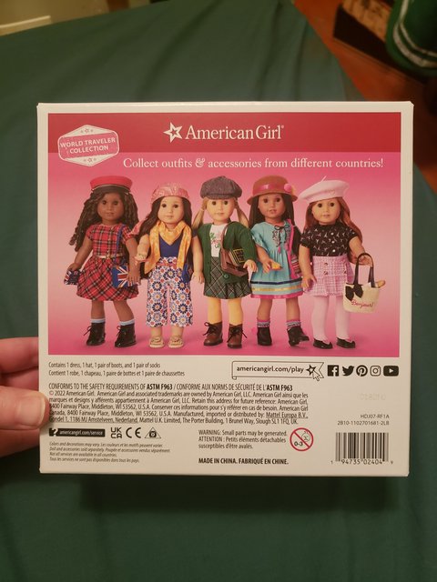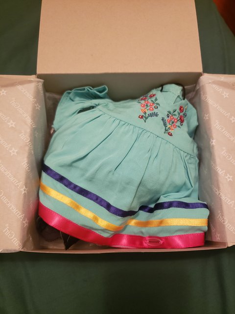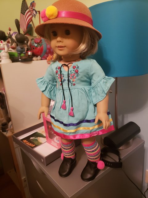 From the AG website:From climbing Machu Picchu to strolling museums in Lima, Peru offers beautiful coasts and fascinating cultural sites. This set includes: A turquoise dress with flounce sleeves, floral embroidery at the bodice, ribbons on the hem, and a tasseled tie closure at the neckline A felt hat with ribbon trim on the band and two pom-poms on the side A pair of black ankle boots with a pink pom-pom at the side A pair of multicolored striped socks $36 Dress - The color is a very pretty turquoise with beautiful embroidery on the bodice. The fabric is a bit wrinkled straight out of the box but I think that'll loosen up over time. I love the mini tassels on the tie at the neck. The dress itself is very short, more like tunic length instead of a dress. I think it would look great with jeans or leggings too. The ribbon trim around the bottom goes all the way around and the dress has a velcro closure in the back. Overall it fits very well. Socks - Bright, colorful and stretchy. Shoes - There is no velcro or closure on these, they just slip on. They do have a small heel. The pom-pom looks like it is sew on with one stitch so it seems like they could be easily removed if desired. Hat - The hat is made from a stiff brown felt with a shiny satin pink ribbon around it. The pom-poms are machine sewn on with multiple stitches. They look a little more difficult to remove than the ones on the shoes. A- due to the shortness of the dress. Overall this outfit is very nice.