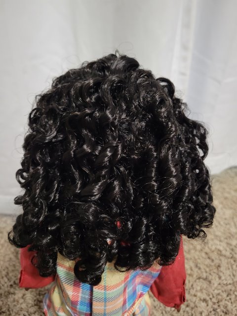 Her hair is mostly black and in ringlets, with a couple short ringlets on each side. I was kind of surprised by the length and might have preferred it a bit shorter for this time period. All curled up, her hair falls a bit below the shoulders, but if the ringlets are pulled out straight, they’ll go down to her waist.