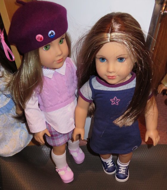 Both Nicki and her twin are hard to resist. They look straight ahead (begging to be the one to go home with you), not down at the ground like Josefina. You all know we’re suckers for the Joss face mold, and that straight-on gaze is a big part of the draw for us. Oh, did I mention that? They’re definitely the Joss face mold. Their skin tone is the regular light #10 that you’d know from Julie, Rebecca, Corinne, et al. Don’t let AG’s retouched and/or overlit stock photos fool you — they are not the #05 light tone (like Blaire). Both of these straight wigs are fuller than you’d expect from recent AG releases and have a nice silky body about them. We think they’re pretty nice wigs (for AG wigs), not skimpy or see-through. These are two of the cutest dolls (if you like the Joss face)! If you want someone to choose the doll for you, give the Chicago AG store a call and ask for a Personal Shopper. There’s no extra charge to the buyer, and a number of people use them. It’s a service offered by that store, and the PS have good reputations.
