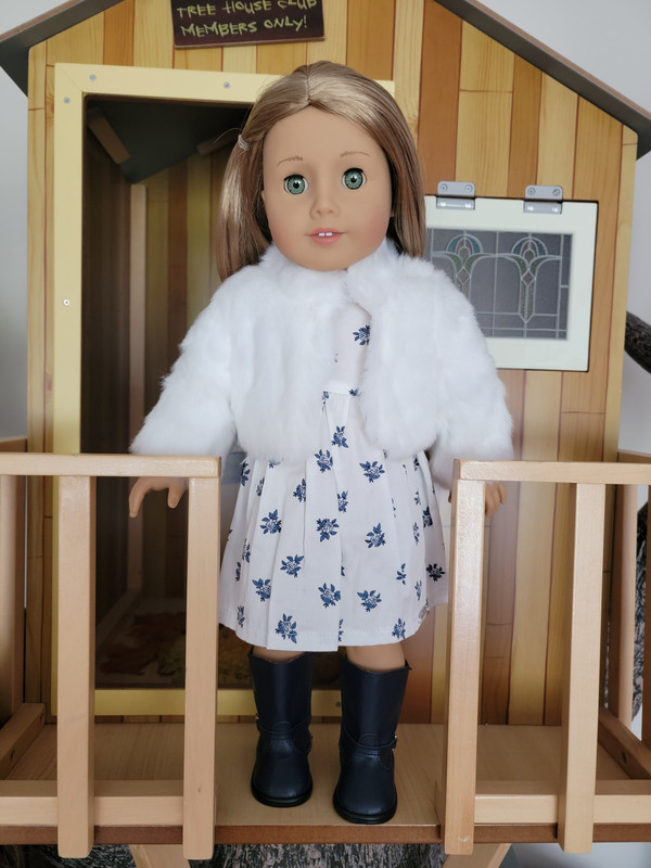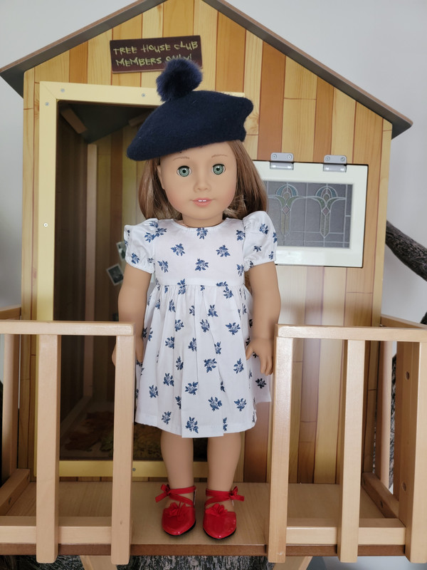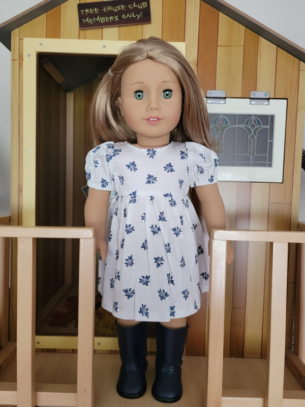 I was motivated to get this cute dress back in summer 2023 partly because of the mix-and-match potential with the Janie and Jack pieces, as shown by a previous poster, but the dress is also a very cute stand-alone piece. Here are some additional thoughts and photos ... Description: Classic style blooms with this sweet and subtle floral print dress designed in collaboration with Something Navy. Includes: A white-and-navy floral print dress with puff sleeves and a bow at the back. $16 Pros: I think this is a really cute and pretty dress. The crisp white cotton (or cotton blend?) background with the navy blue floral palette is both attractive and basic enough to easily match it with items from other collections. With sandals, it's appropriate for spring or summer, and by changing out the shoes and adding a sweater or jacket, it's perfectly appropriate for colder seasons, too. The thin fabric and short puff sleeves help ensure that nearly any sweater or jacket can easily fit over the dress. It closes with a single strip of Velcro up the back, and the pre-tied bow is sewn onto one side, so the bow will always stay tied just the way it is supposed to be without any worry. Cons: I really like this dress and don't really have too many cons. As a previous poster mentioned, the fabric is on the thin side but not so thin that it feels cheap; I purposely put the dress on Gabriela so you can see how it looks on a darker doll, and while I think it looks fine without a slip, I do agree that you can slightly see the darker tone underneath the dress. Another possible con is that the neckline is wide enough to see the neck wrinkles on dolls like Gabriela, who were made in the years when neck wrinkles were common. (I admit that's kind of a reach in terms of criticisms, though, as the wider neckline also makes the style look cute and more updated.) Overall, I'm really glad to have this dress. Although a relatively simple design, I love the color palette, design, and flexibility of this piece, and I think it was a great deal even at the original full retail price. I give it an A. With the Janie and Jack beret and boots (2022):  The puff sleeve with elastic at the cuff:  A close up of the floral design:  View of the back:  The bow is pre-tied and sewn onto one side of the Velcro-backed dress:  The plastic oval vanity tag on the doll’s lower left hem:  Here she is without the boots, for a better view of the length (or to imagine different shoes on her):  The dress comes in a package with a thick cardboard hanger:  The back of the package shoes shows other Something Navy items in the Summer 2023 release: