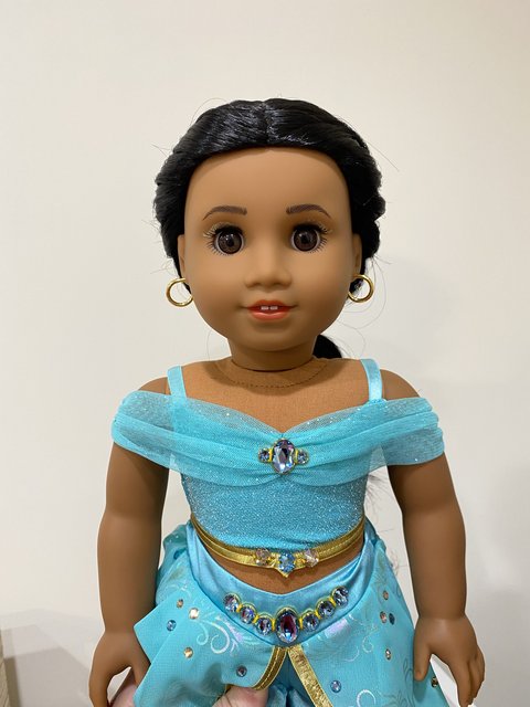 An 18” Jasmine doll with brown eyes that open and close and long black hair styled half back in signature twists and a segmented ponytail. She has a soft cotton body, and her movable head and limbs are made of smooth vinyl.