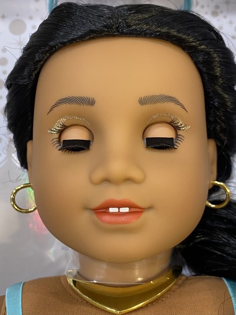 Her outfit is top notch. I love it. Her eyeliner is higher up on her eyes than you might think. I like this though since you can still see part of the eyeliner when her eyes are open. The lashes and eyeliner effect is pretty and gives it something extra.