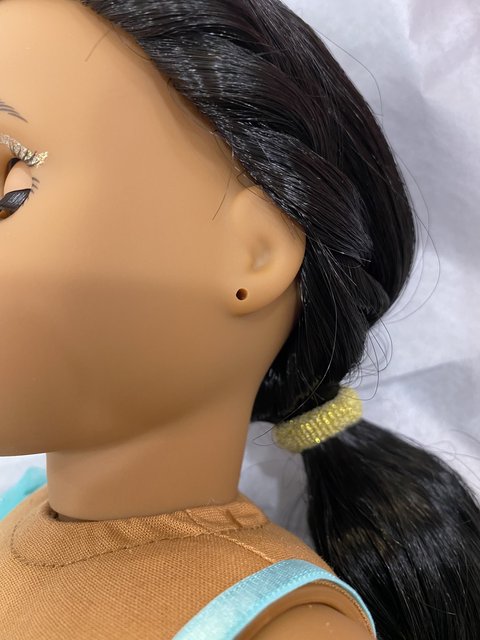 I had seen someone who got Jasmine say that her necklace was plastic. It is not. It is metal, but it is covered in a gold paint. Her earrings may or may not be metal, it is hard to tell on such a small thing.