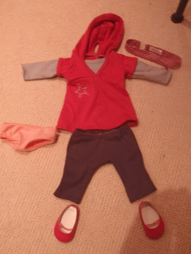 This outfit is a good Meet outfit. The outfit looks a lot like an outfit you would see little girls wearing today. Grey leggings with a longer shirt, matching headband, and slip on shoes with no socks. The leggings are grey and hit just below the knee. The shirt has the appearance of a layered hoodie, with the grey undershirt and long sleeves actually sewn onto the dark pink overshirt. The headband is plaid and matches the star on the shirt. The shoes are pink slip ons that match the shirt as well. This outfit does come with a pair of coral color undies. Overall I would give this outfit an A-. The only downside to it is the shoes are really hard to get on- the material they are made from is weak and so it takes several tries to get them on over the heel. I don't know if putting socks on would make it better or worse. Here is a picture:
