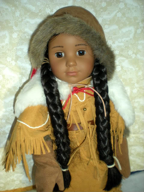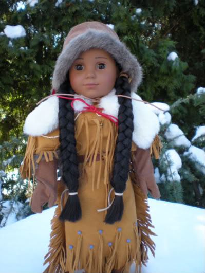 This set was released in 2002.Kaya’s cape keeps her warm during cold winters in the valley—she would have sewn four rabbit hides together to make it. Her winter wear includes moccasins, long mittens, and a hood trimmed with faux fur and real feathers.Winters in Nez Perce territory were cold and snowy, but thanks to their bountiful hunting, Kaya and her family have plenty of hides and furs to keep them warm. Bundle Kaya up in this outfit that includes: A cape of faux rabbit hides sewn together, Faux-fur-trimmed lace-up moccasins and mittens, A hood with real feathers and faux-fur trimKaya’s Winter Cape & Hood $22 WCO Grade: B I really do like the idea of this set. I have a total bias towards fake fur. I would always rather see the real stuff. I know for kids it isn't always realistic but I always prefer it. The strings are the other reason I lower the grade on the set. The detail of that is written in the descriptions below. The cape is nicely made and lined. They cut the fur in a zig zag in the edges so that it gives a skinned animal effect. I suggest when you put it on the doll that you put the cape on and then add the hood after. It can be a little tough to put on for kids. The hood is made form the same faux suede that is used in the mittens. It is aslo trimmed with the same faux fur. Attached onto the front tip are two small feathers. One is red and one is spotted. I really do not like the ties for the cape or the hood. It is a stiff string that slips out of it's knots. The mittens easily fit on the doll without any effort. They are finish trimmed with some fake fur like on the hood. the come up nice and high almost to the elbows. The mocasins are nice too. Same suede material and faux fur. The laces are nice and long and easlity wrap enough times to hold the mocs on then be tied with little effort even for my daughter.  Attachments:
