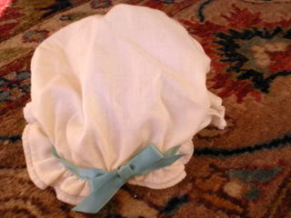 The mob cap is double ruffled and has a ribbon, As always, I find it hard to get it to lie nicely on the doll's head.