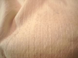 I really love this dress. The pale green stripes and bow on the mob cap coordinate nicely with Felicity's eyes and the off-white color makes a nice change from the rest of her collection. I love the apron, which is made from a textured woven linen. For historical accuracy, Felicity can tuck the kerchief into her bodice or pin it closed in front. This outfit is just right for Felicity to wear on baking day or while gardening or working around the house. A Here are some pictures of the fichu and the pattern in the apron fabric. The apron tie is 34" long and 1/4" thick. The apron is 8 1/4" long and 8 1/2" wide closest to the waist and tapers down and out to 13 1/8" at the very bottom.  The fichu is a triangular piece of muslin 16" along the top and 11" along each side.  Only the apron is patterned. Mob cab is off-white muslin with pastel green ribbon