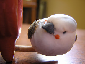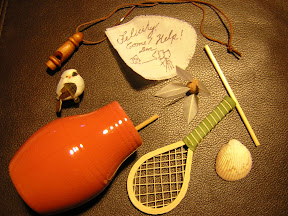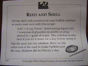 This set includes a shuttlecock (racquet), battledore, shell and two reeds, bird, bird bottle, note from Ben and a whistle. The shuttlecock is a light wood with string woven through it and green something wrapped around the handle (I only wish I'd gotten the set that came with two), the doll can hold this and balance the battledore on it. The battledore is a cork ball with feathers in it, looked great new, but my feathers disintegrated while it was sitting unused in it's box. The shell and reeds are just that, a little shell and two plasticy reeds for blowing bubbles. I can get Felicity to balance the shell on one hand and hold the reed between the fingers of the other, so it at least kind of looks like she is using it. The bird is cute and has a little plastic tube to help it perch on the bird bottle, unfortunately mine broke off while I was putting it on the perch so mine sits in the opening of the bottle with the note wrapped around her. The bird bottle is terra cotta pottery with a stick perch through it. The bottle is glazed everywhere but the back and the glaze has a tendency to craze. The note from Ben is printed on a scrap of fabric with unfinished edges, looks just like the picture in the book. It also looks like it would fray easily so I left mine in the plastic it came in and it still looks new. The whistle is adorable, it is made of wood and comes on a leather cord, and best of all it actually works. B