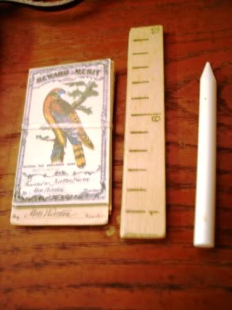 The picture on AmericanGirl.com still shows the slate pencil as being with this set. I received mine today and was a bit disappointed that it was just a small piece of (broken) chalk. But I'm planning on using it up, so it really doesn't matter what Kirsten writes with. The little Merit Reward cards say on the back that they are actual reproductions of the originals. The Child's First Reader book is simply adorable. The "12 inch ruler" is really pretty scale size to Kirsten. Definitely worth this month's sale price of $14. Grade A Kirsten and her Slate Bag & Supplies