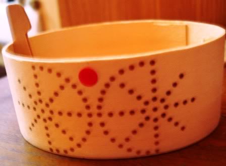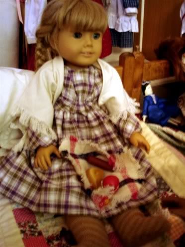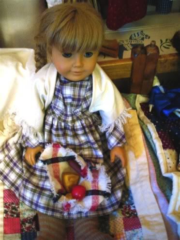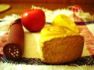 This set includes the tine, napkin (earlier sets), a sausage, wedge of cheese, chunk of bread and an apple. I got the original Pleasant Company version of this lunch with the original tine and napkin for poor lunchless Felicity. The tine is thin wood with a pretty woodburn design on it. It seems a bit fragile and is a little tricky to open, but mine is still in one piece after years of use. The napkin is a heavy cream coloured woven material with red and blue stripes and fringed edges, mine occasionally sheds a thread or two but still looks great. The food is very sturdy and well made and fairly realistic looking. You get part of a loaf of bread, a wedge of cheese, a sausage and an apple, all of which can be wrapped in the napkin and tucked inside the tine. A