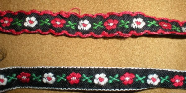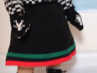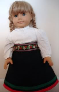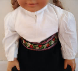 The skirt, however, is lovely - a thick wool felt that holds a hooplike shape with an embroidered waistband and bias binding trim. It's really festive for the holidays - although I also have Kirsten's Santa Lucia gown, I prefer to have her in this ensemble with her "woolens" during the holiday season. The ribbons are also very pretty! They coordinate well with the skirt.
