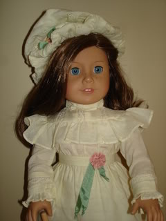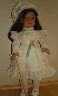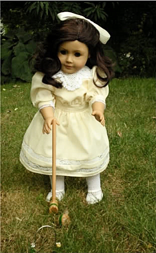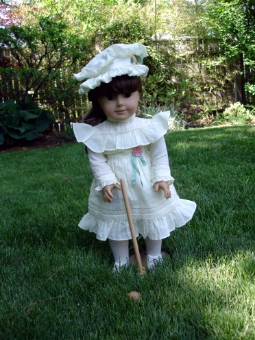 I can't believe this outfit sells so high on Ebay, I just saw one sell for $185! I got this outfit the year it came out, December 2004. The dress - this dress is made from a very thin cotton in a pretty creamy shade. I would say the fabric is too thin, although this is a summer dress; it also wrinkles fairly easily. I love the lace details on the yoke, skirt and sleeves! The waistband is also accented by a thin, ribbon-y flower. I think this dress would look very nicely under Sam's duster, and I like it better than her birthday outfit but it's still not my favorite. Maybe it looks better on Mattel Samanthas than my PM #14. BThe hat - the hat was kind of a bummer, I haven't used it very much. It is made from a mesh-like material and the same cotton as the dress, but with an eyelet texture. It doesn't puff the way catalog pictures show, it lays flat and oddly on the doll's head. There are also a few ribbon flowers on the hat. I like how it was based off a real historical piece, but I think the doll version could have been done much better. CThe croquet accessories - I'm glad these were included, they were the best parts of the set! Both the ball and mallet seem to be real wood partially painted green, very similar to the AGoT set that came out in the 90's. The wicket is made of bent wire stuck into plastic bases made to resemble grass and flowers. These pieces look really nice in displays, too. A