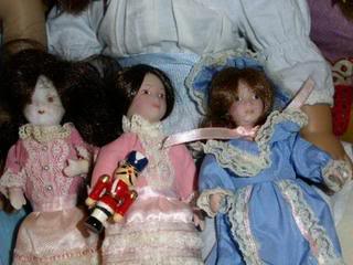This doll is very delicate and shouldn't be played with by a young child. She is made from real porcelain and her hair is a wig which can easily get ratty. Her pink hair ribbon and Nutcracker doll are also easily loseable. The details on the PM doll's dress are exquisite and well-made-tiny "seed pearl buttons", lace and velvet. Her face is lacking in color and she looks like a ghost next to the current version. Overall grade for both: A original version far left, newer version middle, Nellie's doll Lydia right