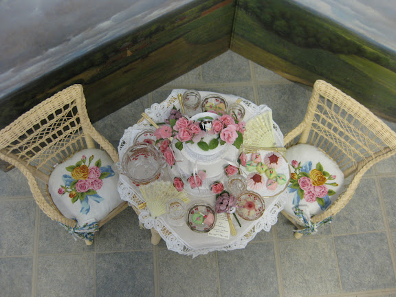 Wicker was the popular summer furniture found on Victorian porches and in garden gazebos. Samantha's table and two chairs are miniature reproductions of pieces that were made at the turn of the century by the well-known wicker designer, Cyrus Wakefield. Plump, comfy cushions in an enchanting cabbage-rose chintz are tied to the chairs with big puffy bows. They're perfect for the leisurely, luxurious life the Victorians loved. Won't you pull up a chair?
