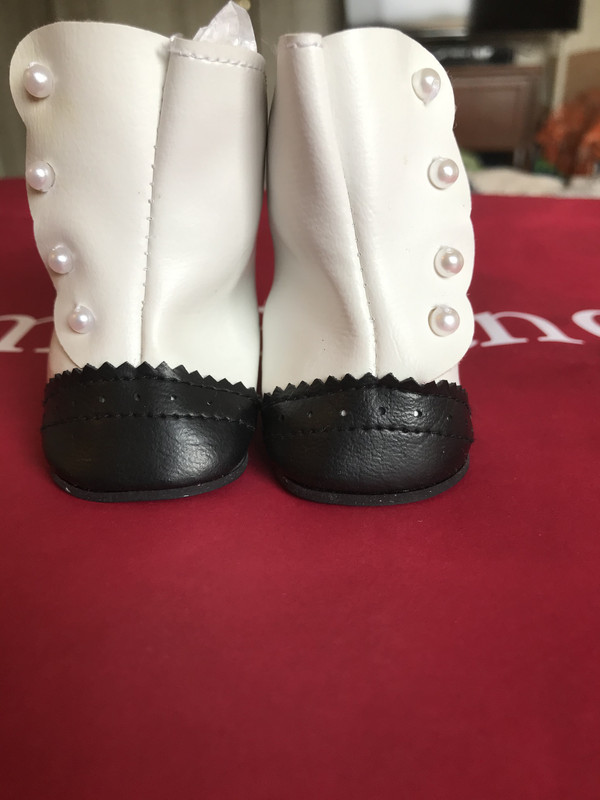 High button shoes in black and white are a stylish part of Samantha's wardrobe.These shoes are made from stiff placticy leather, similar to Kirsten's boots but more stuff. They button on the sides with faux pearl buttons and look very authentic. They are tough to get on Samantha's feet, though. I think these boots are OK and a nice addition to Samantha's outfits, but I don't like the stiffness of the "leather." I prefer the off brand white high button shoes that feel more like real leather. Grade: B+