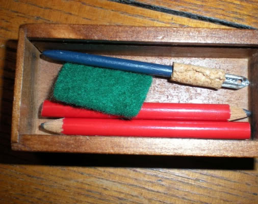 Samantha uses a pencil box made of cheap, thin wood that is heavily stained. Inside are two standard issued American Girl school pencils, pen and a felt wipe. The Looking Back section of Samantha Learns a Lesson explains that it was very important for Samantha to keep her pen clean so impress on Samantha to use to tiny felt piece to wipe up dripping ink. Furthermore make sure Samantha understands to keep her pen and pencils in the box since they are tiny and easily lost.