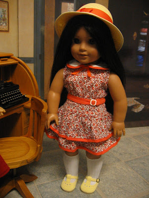 The outfit is terrific! It is nice and girly without being so frilly that it does not fit Kit's personality. I love the orange bias trim on the two tiered skirt and collar.The bow on the collar is made of orange gross-grain ribbon.The belt is sewn to the outfit, and is a very cute addition to the outfit with it's off-center white plastic buckle. The collar on this outfit is a waffle textured cotton.