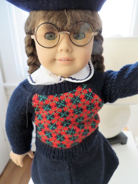 My Molly is the most gorgeous doll I have ever seen! I give her an A+++! Not sure exactly of her year, but it is 88-90, and I purchased her as never removed from her original box. She has the squishiest vinyl, nice plump body, shorter neck strings, Pleasant Company neck stamp, no body tag, meet outfit tagged Made in Hungary, the original silver glasses with the curved ear pieces, and the most amazingly soft, beautiful coloring. Her hair is a bit lighter brown than the Mattel version,and the bangs are shorter. Mattel clothes are just a tad bit tight on her. I absolutely adore her, she is my favorite doll ever. She is the first PM doll that I have seen in person, and I am stunned by the difference in quality. Not that I think the Mattel dolls aren't great--I adore my Kit. But there is just a higher level of quality evident with the pre-Mattel dolls. Molly's meet outfit is very well made. Her sweater, skirt, and dickey are all in pristine condition and seem that they would hold up well to play. The silver glasses are a bit difficult to get on and off, but once on, they do not move. The ear pieces curve all the way around the back of the ear. Her hair is soft and silky, and very shiny. I have not removed it from the original braids. Her eyes are a lovely, soft shade of gray. She has a very sweet, innocent expression, and seems to look "younger" to me than the other AG dolls we own. Here are some pics of her in a couple of her favorite outfits