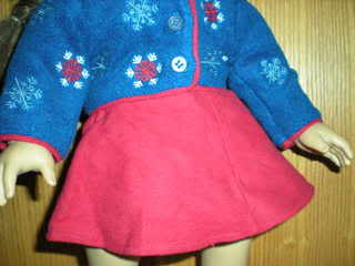 I was surprised to see no review up for this yet! Anyway, this is a really cute outfit. The red skirt and matching spankies are really cute and well-made. They are made of a thick flannel/felt material with a smoother underside. The skirt closes with velcro and the spankies are just pull ons with elastic. The jacket is made of a more fleecy type matierla with embroidered snowflakes and closes with buttons. The buttons are actually not difficult to open and close, a rarity for AG buttons! I really like this set, which I bought for my Emily and she looks just adorable in it. I give it a solid A.