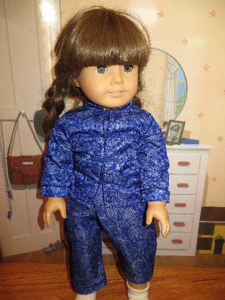 The pjs are really nice and well made. The material is silky, in an indigo blue color with printed floral design. The pajamas are white on the inside as so not to cause staining. The seams are tightly sewn. The top closes with knotted frog closures. The pajama pants are elastic but still tight on a mid-90s PM sized body. They fit white bodied Molly just fine. I don't have the slippers. The slim little book looks a bit lame for the target age group. A younger child might enjoy it more. Grade: A