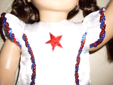 Not sure if this is right name for this outfit. I know its sold at the AG stores. This was one of my ebay buys. I only got the dress. I know this outfit new from AG comes with tap shoes, socks and a head piece. This reminds me of a classic tap dance outfit never goes out of style. Its white satin with red and blue sequin trim I like that the sequins were not over used just enough to give it color. The one thing I don't care is for the red star in the middle of chest I think it would look better if they left that out. This outfit Velcro down the back one good thing the Velcro does not stick to the dress so its very easy to change the dolls in and out of it. I've just been using a pair of white tight and then Marisol tap shoes for now with this outfit tell I get around to ordering a 2nd pair of tap shoes. Over all this outfit gets an A
