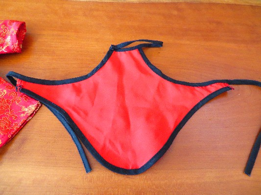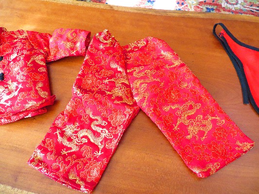 This really is a gorgeous outfit. My stepsister told me she bought this for her #4 doll when she used her for a project on Chinese New Year. The ribbons and flower clips are long gone, but she gave me everything else, including the velvet shoes. Jessa wears this as her Christmas outfit, and she looks lovely in it. It's held up surprisingly well over the years, considering it spent a lot of that time in my stepsister's closet. The frogs are still attached; nothing is frayed or ripped.