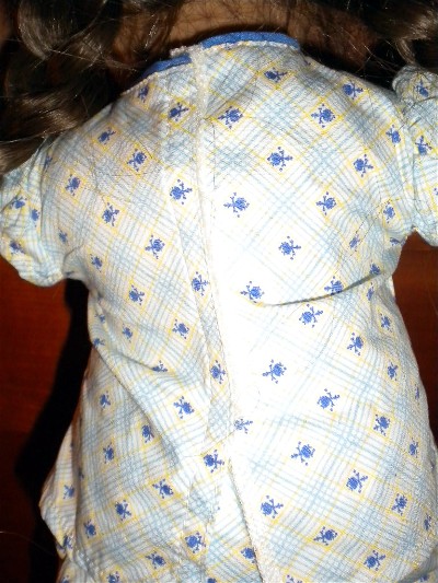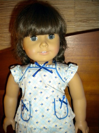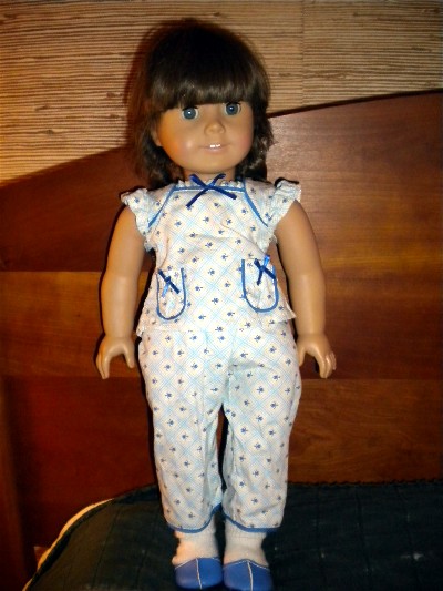 This review is for the 'Floral Pajamas" set. I purchased these on 3-3-2013. Pajama set: These are a two piece set. There is a top and a pair of full length pant style bottoms. And, a pair of matching slippers. The fabric is a good weight cotton. It is strong, polished cotton and pretty thick. The printed pattern is a light yellow and light blue plaid on white. In the center of the plaid boxes are small dark blue rosebuds. The overall effect is very pretty. The trim is made of a dark blue cotton piping, simular to the d. blue rosebuds. Also, there are dark blue satin bows as decoration. The Top: The top reminds me of a shift. The sleeves are 'cap'-style ruffles. The decoration includes the curved/rounded inset at the sholders. This was popular in the early 1940's. The neckline is straight across and has a small ruffle along the top. A d.blue bow is centered on the middle of the neckline. There are two rounded pockets with a gathered ruffle. This has elastic and gives slightly. They have the same dark blue trim around them and d.blue satin bows. The back has a velcro attachment. The Bottoms: These are well made. They are pants with an elastic waist. They fit very well. Molly can sit-up in them. The waist is high enough for her. There is a dark blue cotton piping trim at the cuff of the legs. Which is a very nice finish. The Slippers: Cute Blue Mules, with and elastic back for fitting. I like the style, they have a seam on the top, and look realistic. They fit well too. I'm not happy with the small "kitten" heel. I know Molly would not have had these heels. But, I'm sure this is made for kids, as well as adult collectors. Overall: A+ I am very well pleased with these PJ's. They are the 'Summer" PJ's Molly needed. I am the most impressed though, with the fact that they (AG) made sure that the "Plaid" matched up with the pieces on all of the top and bottom seams! That is hard and very nice. As well, the plaid is on a bias. Which means that there is a lot of care put into this outfit.